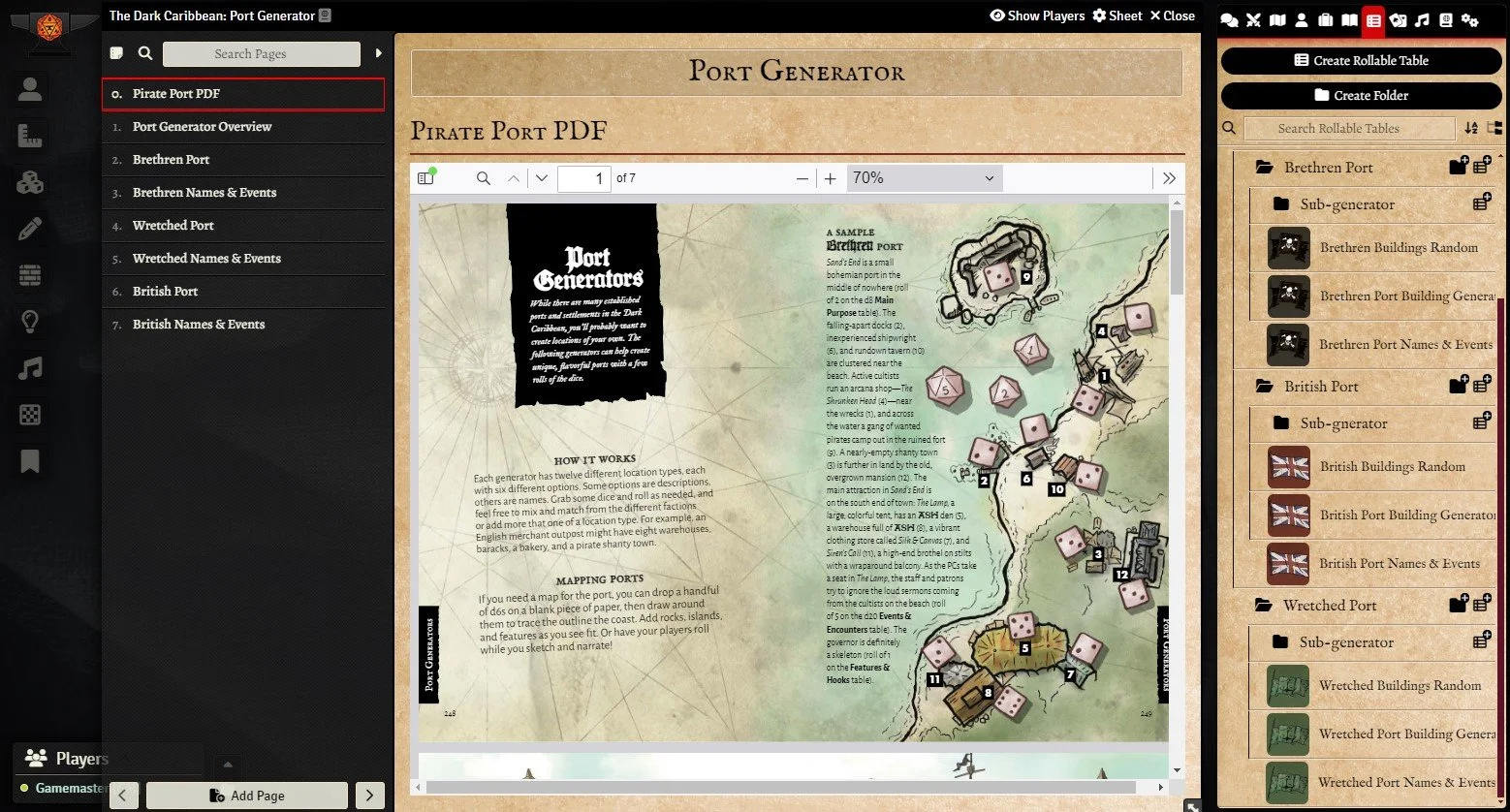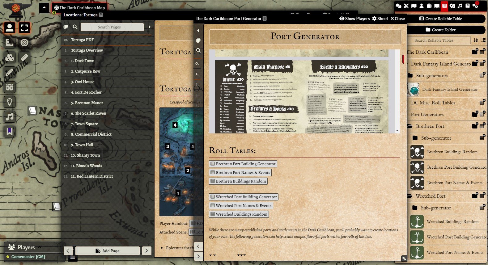 THE DARK CARIBBEAN is a campaign setting with regional and port maps, factions, NPCs, and plot hooks. It will also include extensive tables and generators for biomes, maritime travel, treasure maps, quests, and plot hooks.