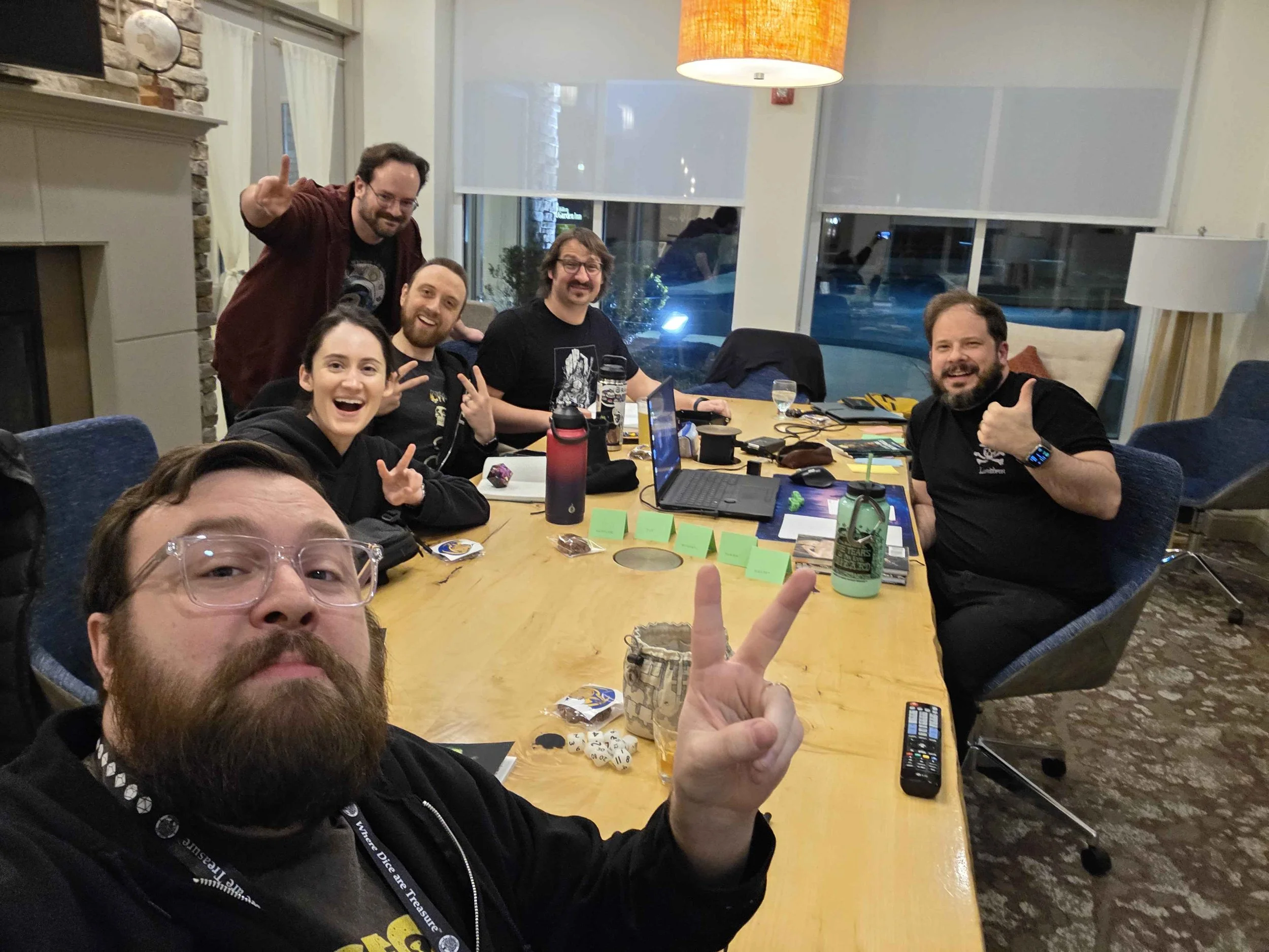But I can’t talk about any of that, so instead, here’s a picture of Luke running [REDACTED] for Jorbin, Joseph R. Lewis, Matt, and Shadowdark’s Kelsey and Michael at PAGE this past week: